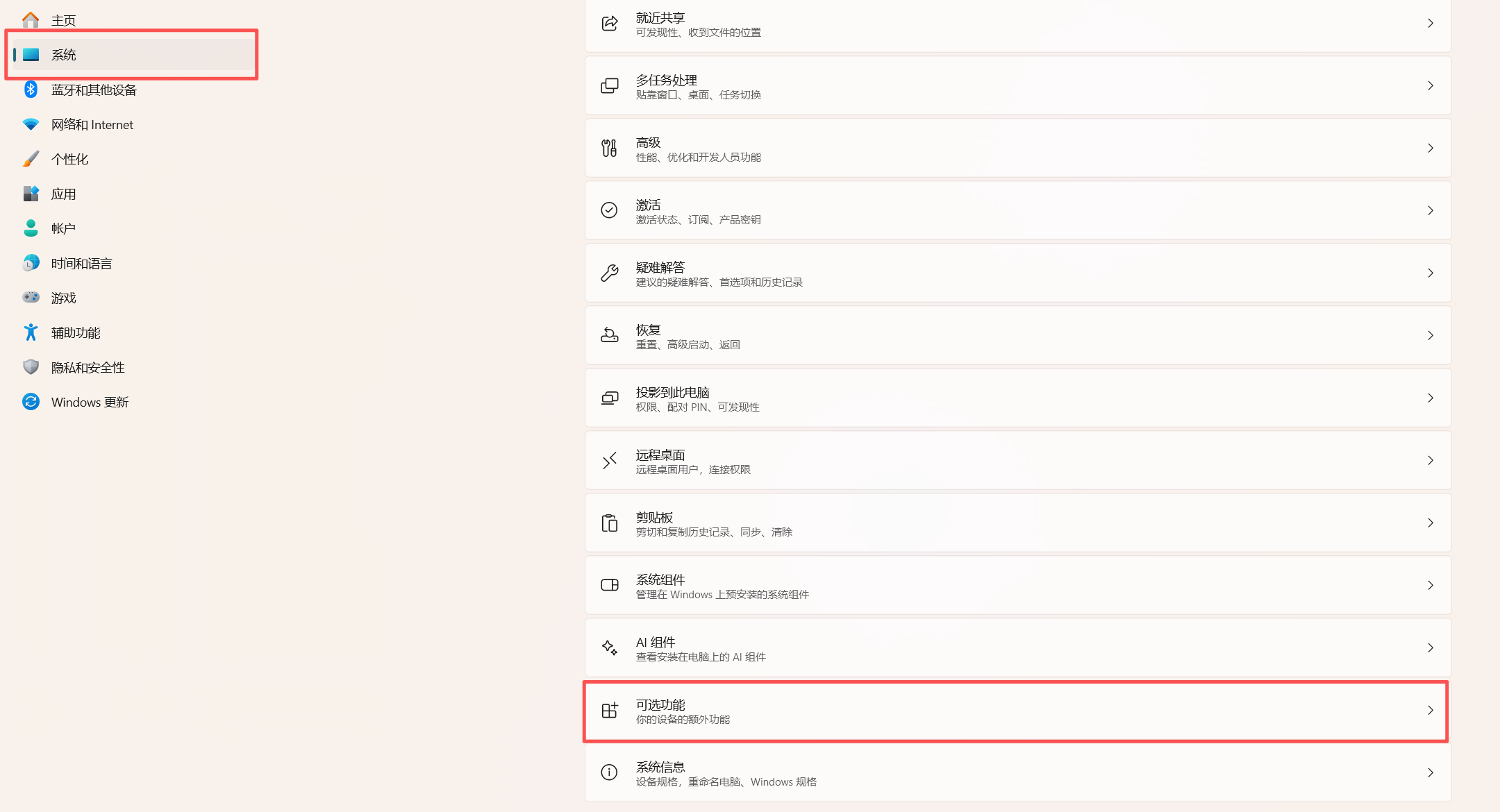 1. 打开【设置】应用,左侧点击【系统】,右侧下翻到【可选功能】,点击打开。