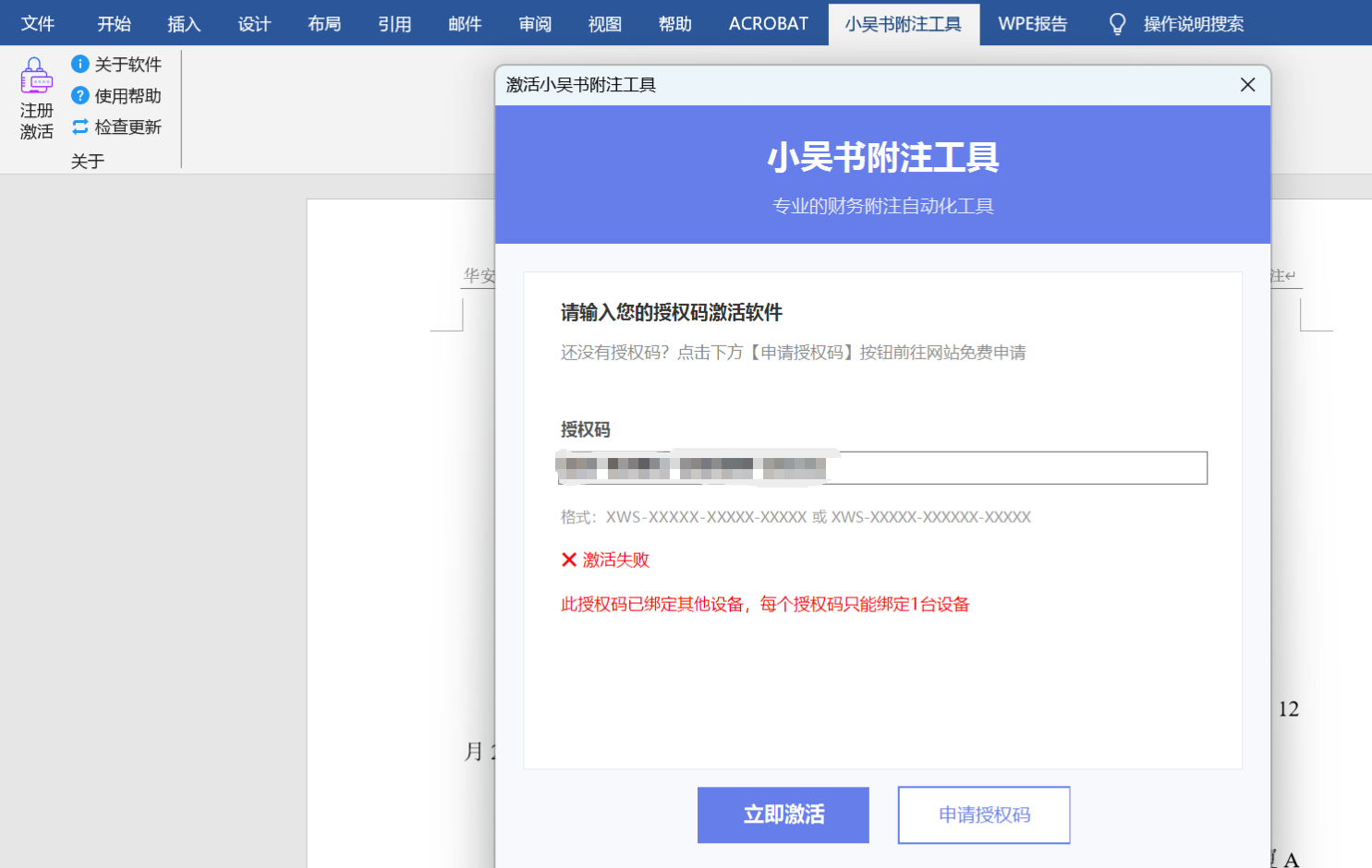 问题 4:激活后,一段时间再打开 Word,发现【小吴书附注工具】和【小吴书底稿饭堂】又提示需要激活,但是输入原来的激活码又提示已绑定。